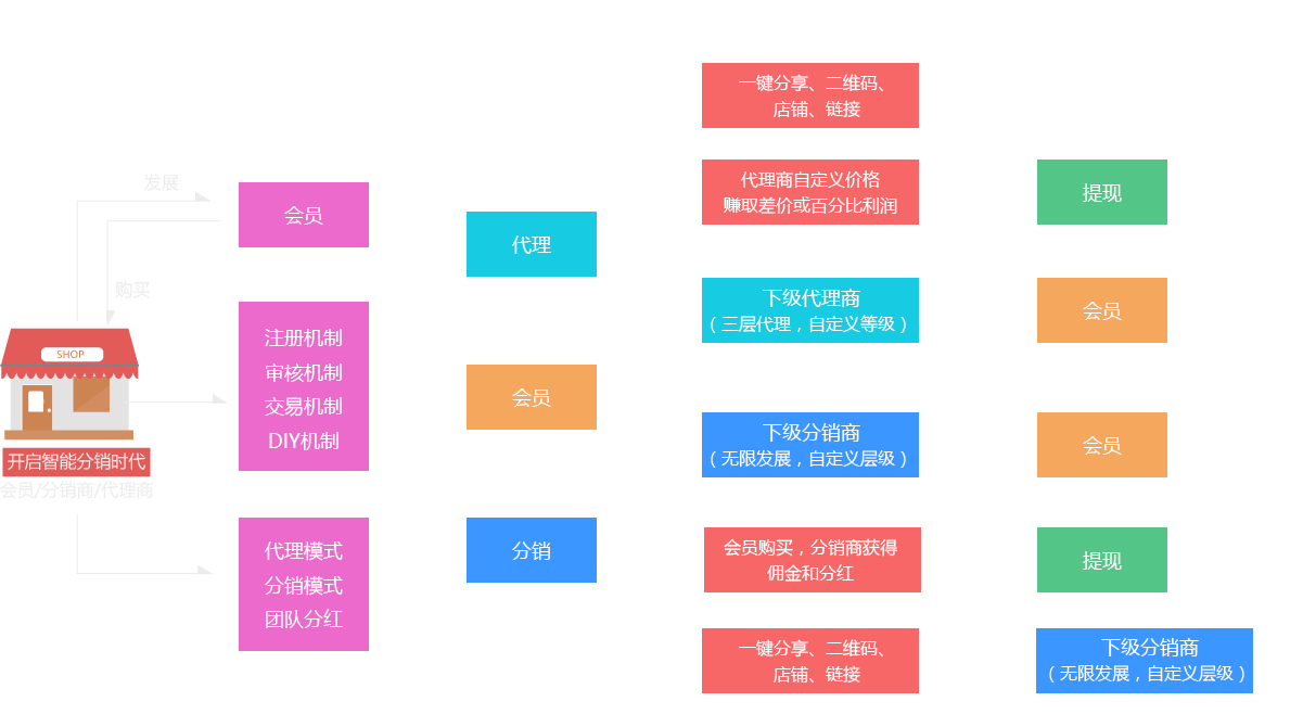 单笔交易成功的用户可选择成为商家代理人,一键注册,实现商品口碑营销,让用户成为你品牌营销的一员