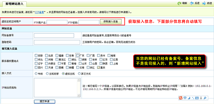 新网站接入:当您的网站已经有备案号,需要用我司空间,备案信息不是我司接入的,则需要进入到“新网站接入